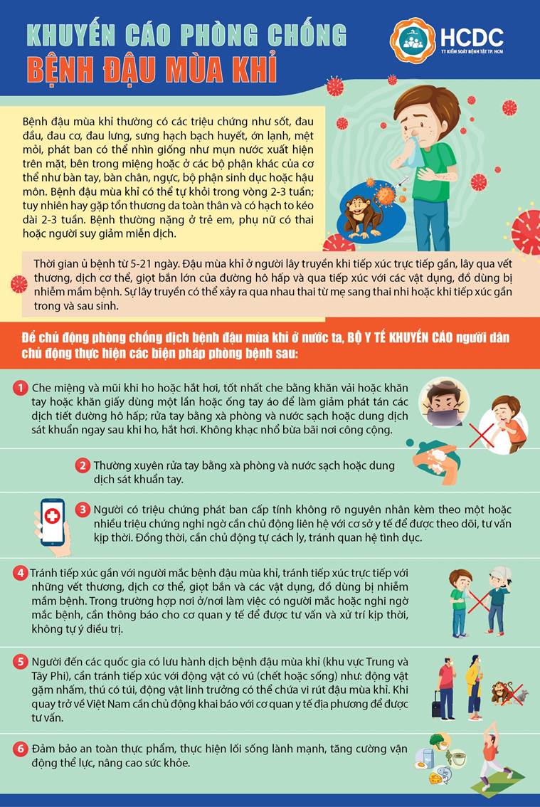5. Người đến các quốc gia có lưu hành dịch bệnh đậu mùa khỉ (khu vực Trung và Tây Phi), cần tránh tiếp xúc với động vật có vú (chết hoặc sống) như: động vật gặm nhấm, thú có túi, động vật linh trưởng có thể chứa virus đậu mùa khỉ. Khi quay trở về Việt Nam cần chủ động khai báo với cơ quan y tế địa phương để được tư vấn.