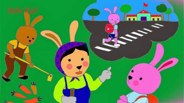 Hai bạn đến trường cũng vừa kịp lúc trống trường điểm vào học. Thỏ con, Chó con cùng xếp hàng vào lớp. Hôm nay, cô giáo dạy về an toàn giao thông, bài “Không đùa giỡn, thả diều, chơi bóng ở lòng, lề đường”. Cô giáo hỏi cả lớp: